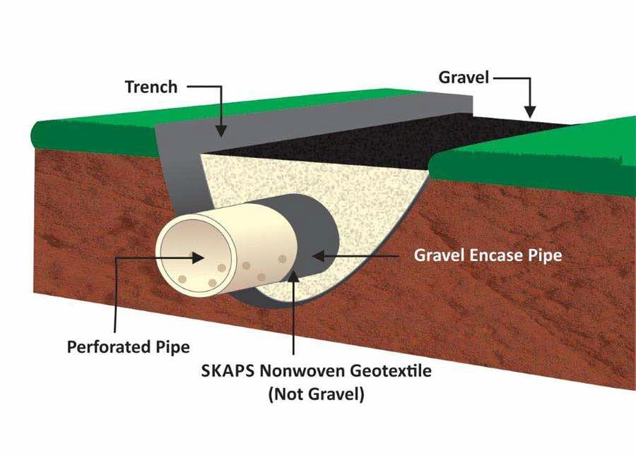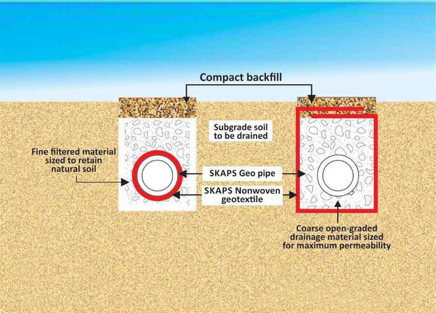 The three-dimensional structure of SKAPS needle-punched non-woven geotextiles allows water to pass through the plane while filtering soils and other solid particles from compromising the overall drainage system. The geotextile subsurface drainage fabric must have the ability to retain fine particles of soil while permitting an unimpeded flow of water into a selected drainage media.